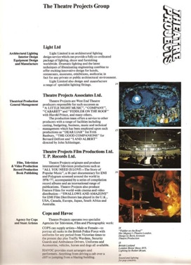 I founded Theatre Projects in 1957 as a stage lighting design and equipment rental service in London with my first partners Bryan Kendall and Viki Brinton. A loan from my father of £150 allowed me to buy second hand lighting equipment from my employer, Williamson Music, that had been left over from the original London production of “Oklahoma!” at Drury Lane. Robert Ornbo soon joined as a lighting assistant and become the first of a distinguished team of lighting designers who went on to illustrious careers